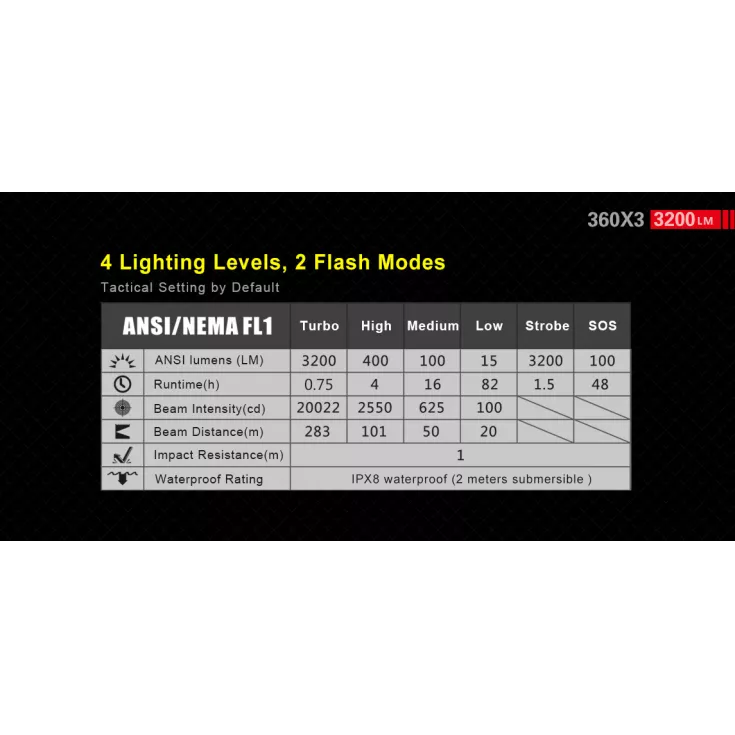 Turbo: 3200 lumens – 0.75 hrs runtime – 283 meters