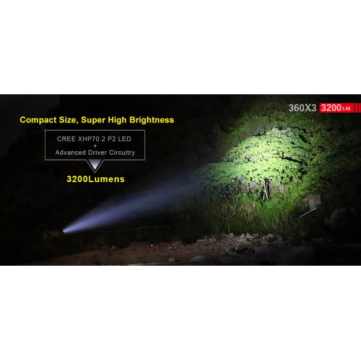 The Klarus 360X3 torch has a maximum output of 3200 lumens from the Cree XHP70.2 P2 LED and is powered by 1 x rechargeable Li-ion 18650 (included) or 2 x CR123 single use or RCR123 Li-ion batteries.