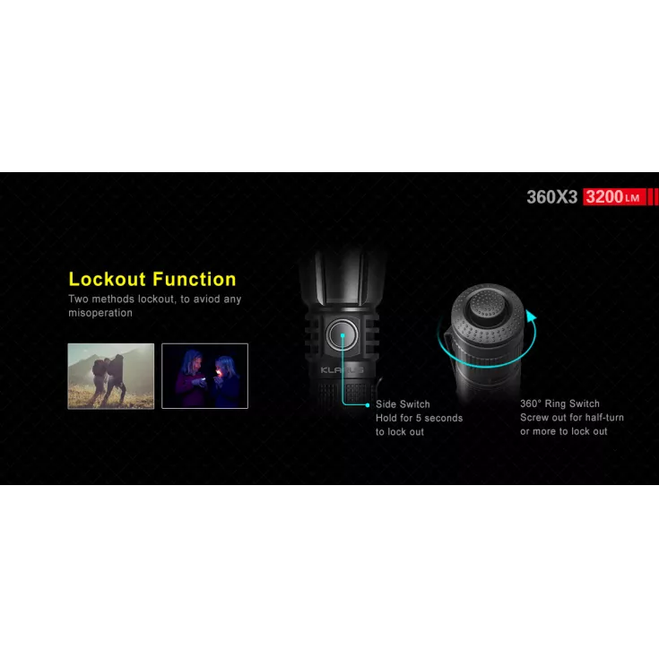 Two methods of lockout prevent accidental operation by holding the side switch for 5 seconds or turning the 360 tail switch 180 degrees or more