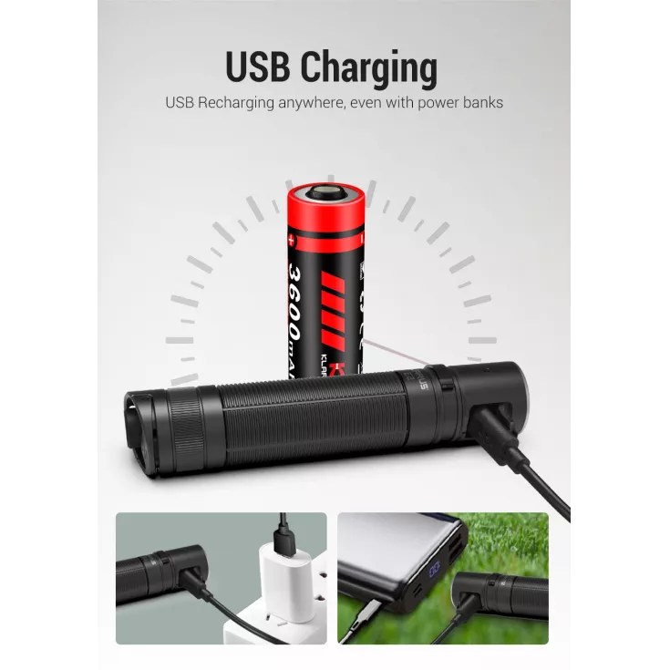 Klarus E2 Includes: 3600mAh 18650 Li-ion battery, wrist lanyard, soft carry pouch and spare o-ring.