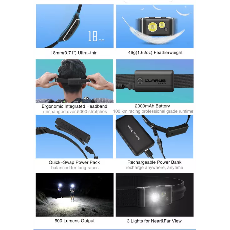 The Klarus HR1 Plus headlamp has a maximum output of 600 lumens and is powered by a 2000mAh rechargeable li-ion battery pack which attaches to the back of the headband. The pack is rechargeable via USB-C (charging cable included) and can be powered by a power bank to lengthen the runtimes if required (power bank not included).