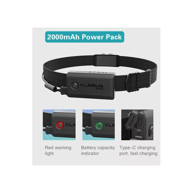 Includes: Klarus PP20 2000mAh li-ion battery pack, USB charging cable, cable clip.