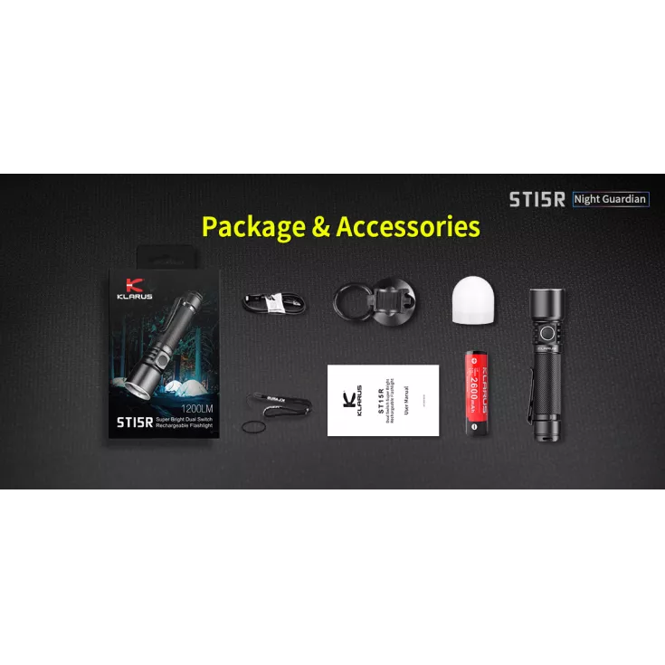 Includes: micro USB cable, lanyard, spare o-ring, Klarus 18650 li-ion 2600mAh battery, pocket clip, bike mount, diffuser.