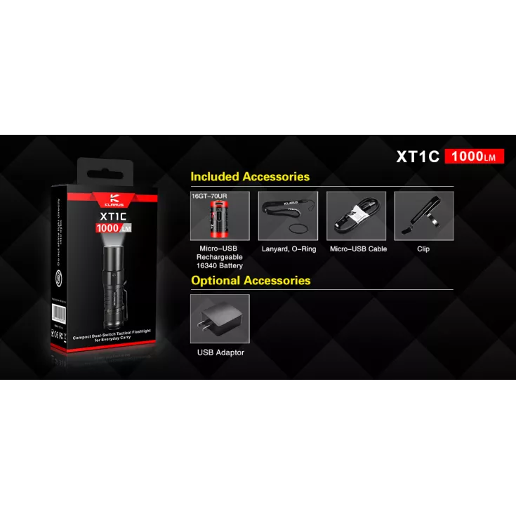 Includes: Klarus micro USB rechargeable 16340 battery, lanyard, o-ring, micro USB cable, pocket clip.