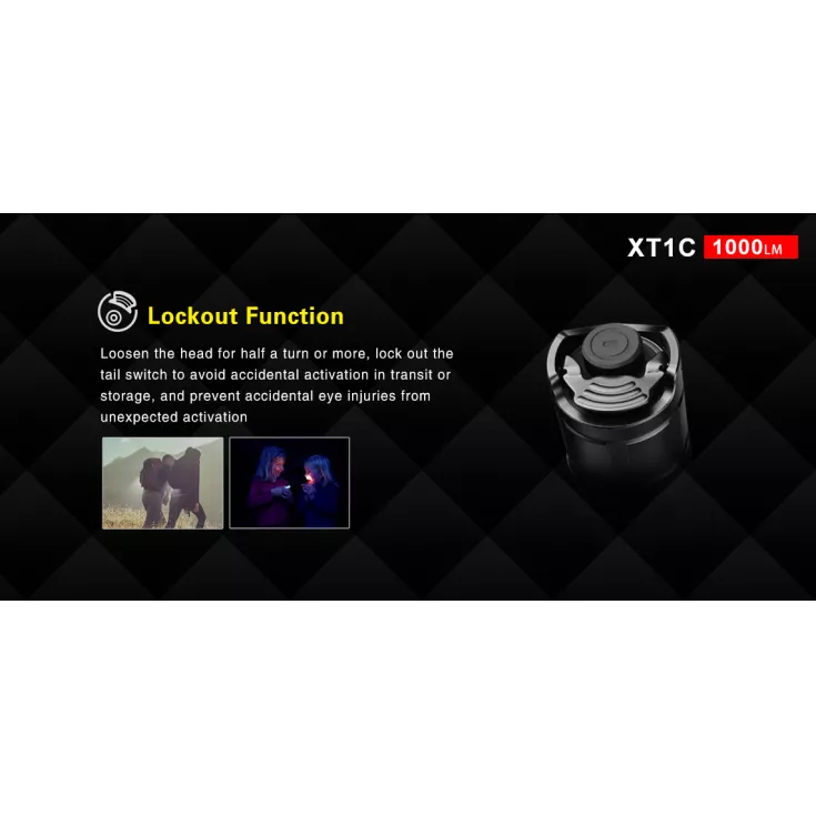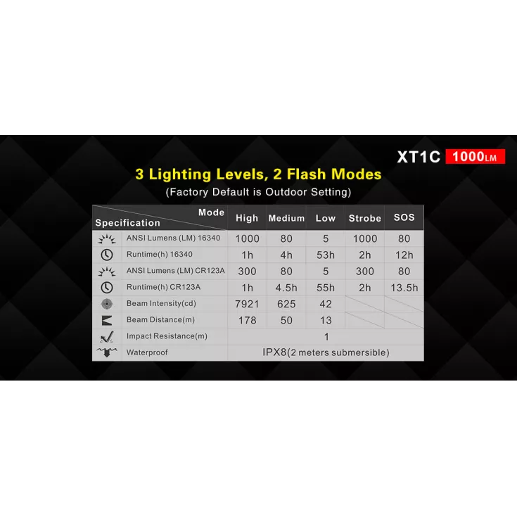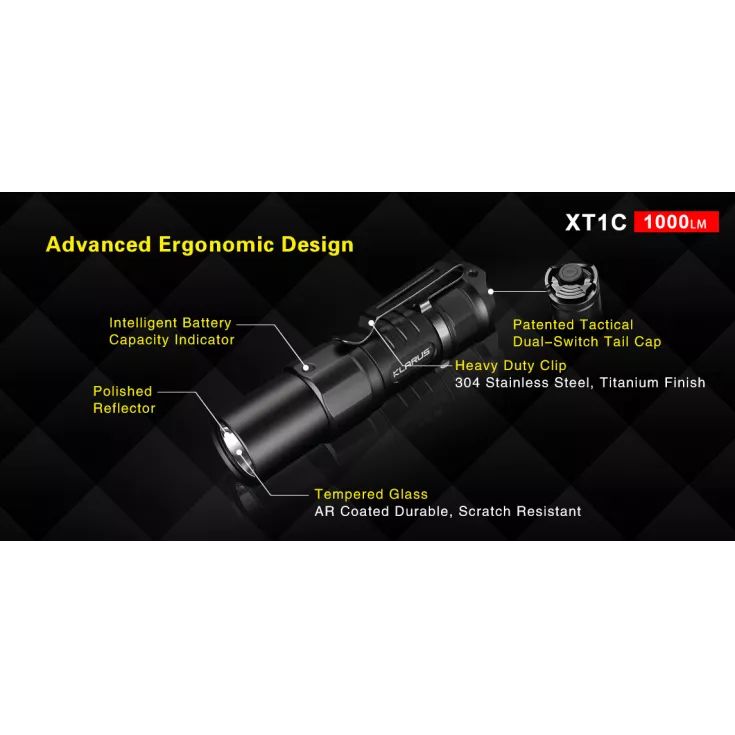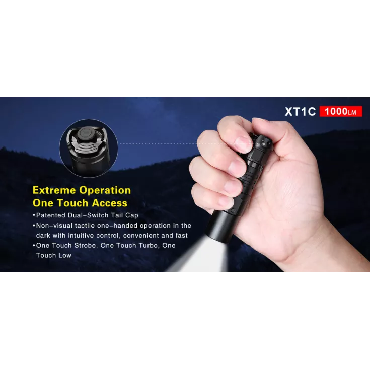 The handheld flashlight features three brightness levels, ranging from 5 to 1000 lumens, plus a Strobe and SOS mode for emergency situations. The XT1C is operated by a dual tail switch which provides direct access to certain modes including Strobe, Turbo and Low.