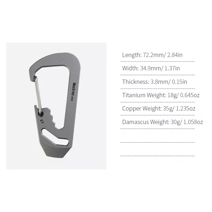 The MecArmy EH3 is a multi-functional carabiner clip, featuring a bottle opener, wrench, pry bar, screwdriver and nail remover. The useful tool is perfect for attaching to your keyring for everyday carry.