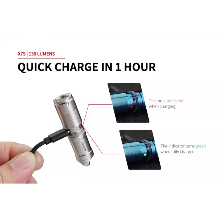 The torch has a maximum output of 130 lumens from the Cree XP-G2 LED and is powered by a 10180 Li-ion battery. The battery is rechargeable via a micro USB port which is easily accessible on the side of the light. Offering extremely fast charging, the X7S torch is fully charged within 1 hour and has a charging indicator which changes from red to green once charging has completed. The X7S features two lighting modes, high at 130 lumens and low at 8 lumens, which are operated by a user-friendly twist switch.