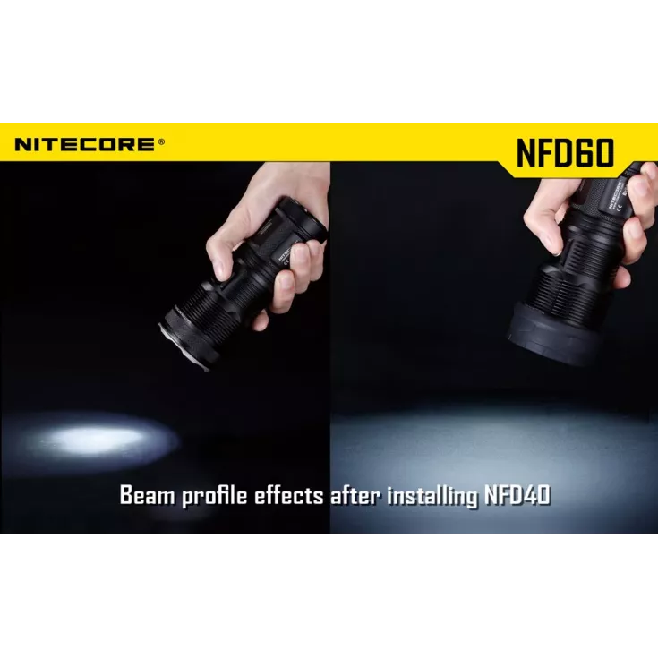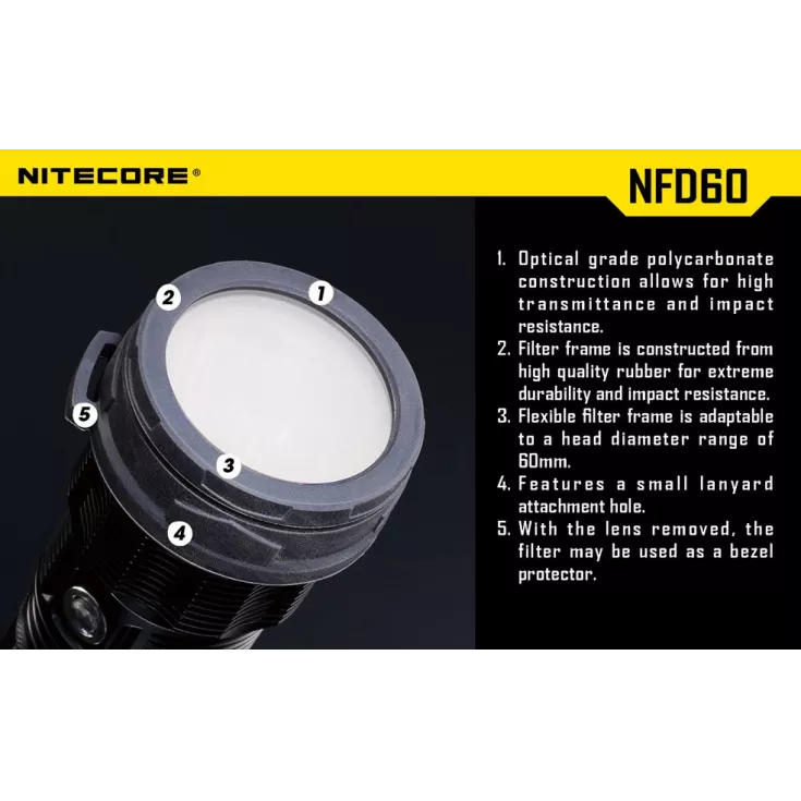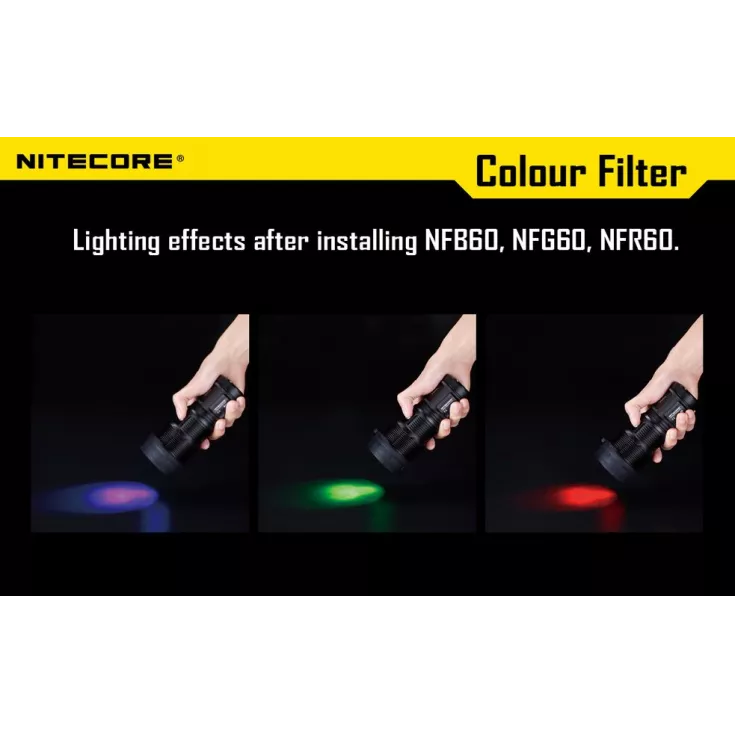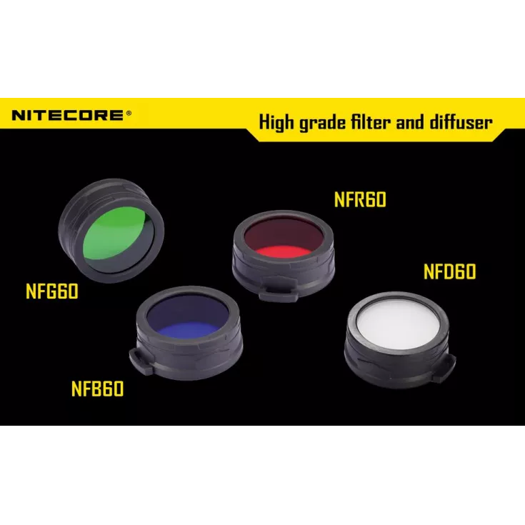 The 60 mm filter is compatible with the following Nitecore torches: EA8, EA81, MH40, MH40GT and MH41.