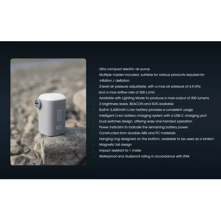 The Nitecore AP10 is an ultra compact electric air pump with a powerful maximum air pressure of 4.5kPa and a maximum airflow rate of 300L/min.