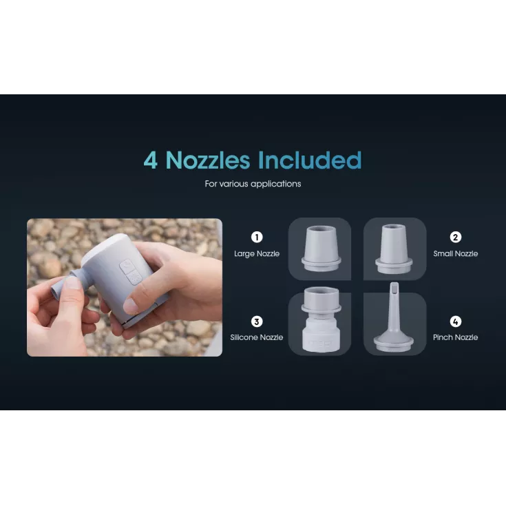 The AP10 comes with 4 nozzles making it suitable for airbeds, air pillows, swimming rings, kayaks and so much more, taking only (approximately) 10 seconds to fill an air pillow.