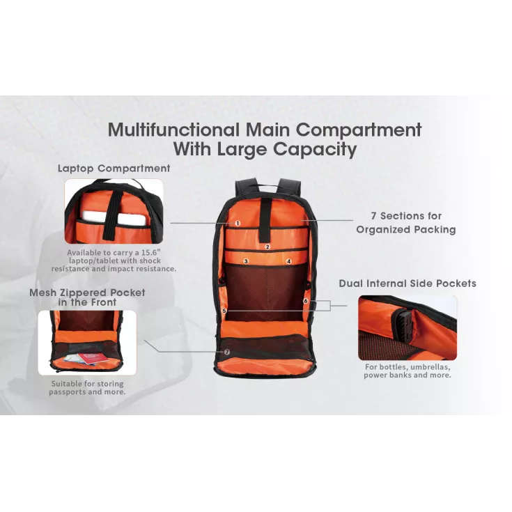 The backpack consists of 4 main compartments. The multipurpose top compartment features a flock lining, effectively protecting smartphones and other electronic devices and the three way divider, provides quick and easy access to essential items. The inner compartment is made up of 7 multifunctional pockets for maximum organisation. It also features a striking high visibility orange interior liner, ensuring identification in low light conditions.