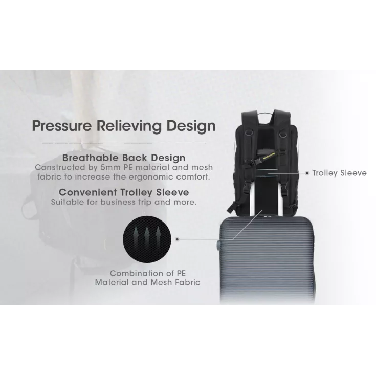 The BP23 backpack is constructed with PE material and mesh fabric to increase the ergonomic comfort. It features a convenient trolley sleeve for business trips and quick release shoulder straps. A MOLLE system allows for modular storage expansions, whilst the multiple handles at four sides offer versatile carrying.