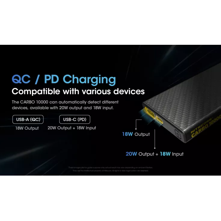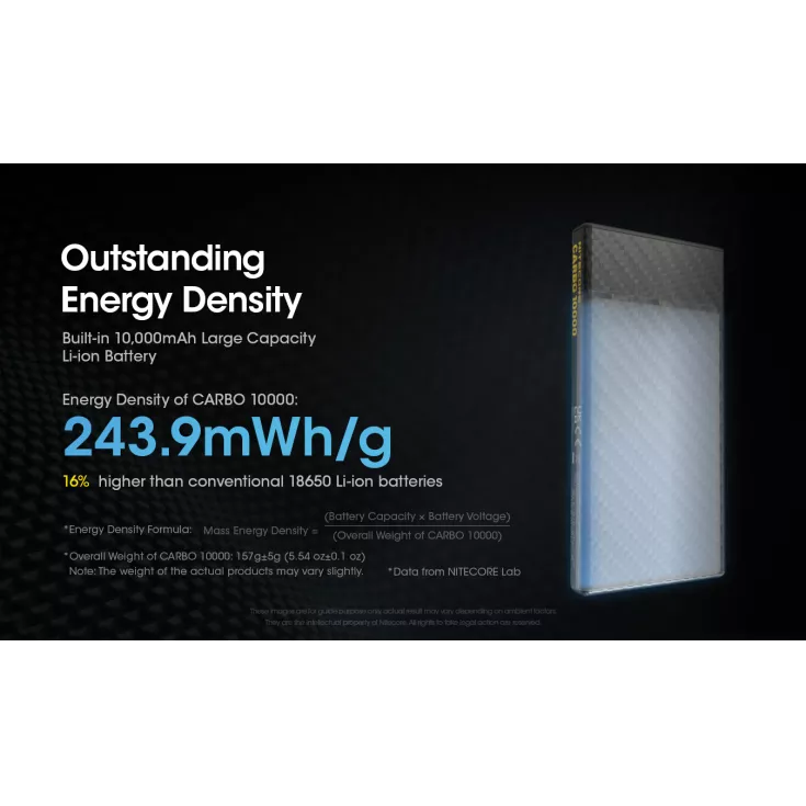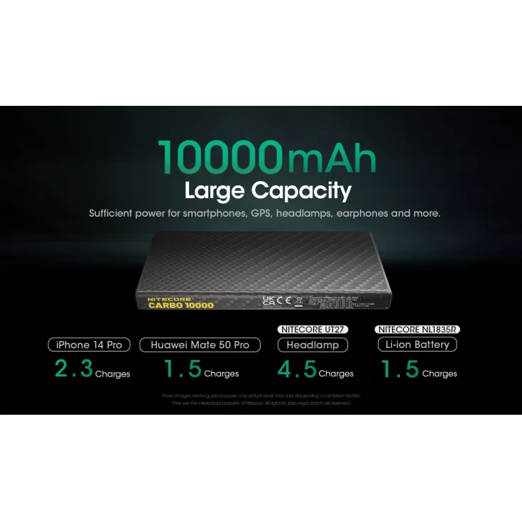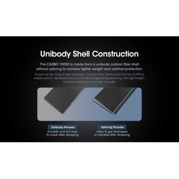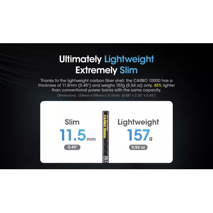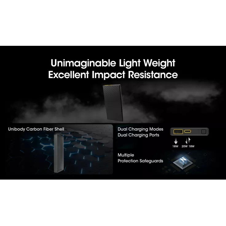 The Nitecore Carbo 10000 is an ultra lightweight, ultra slim power bank weighing just 157g. It is made with a corrosion resistant and durable carbon fiber body offering optimal protection.