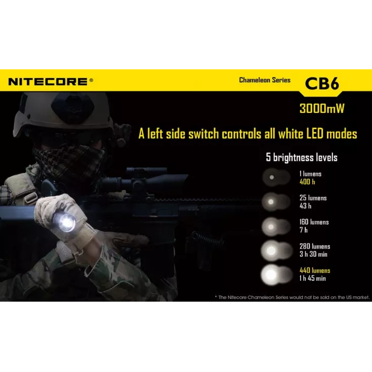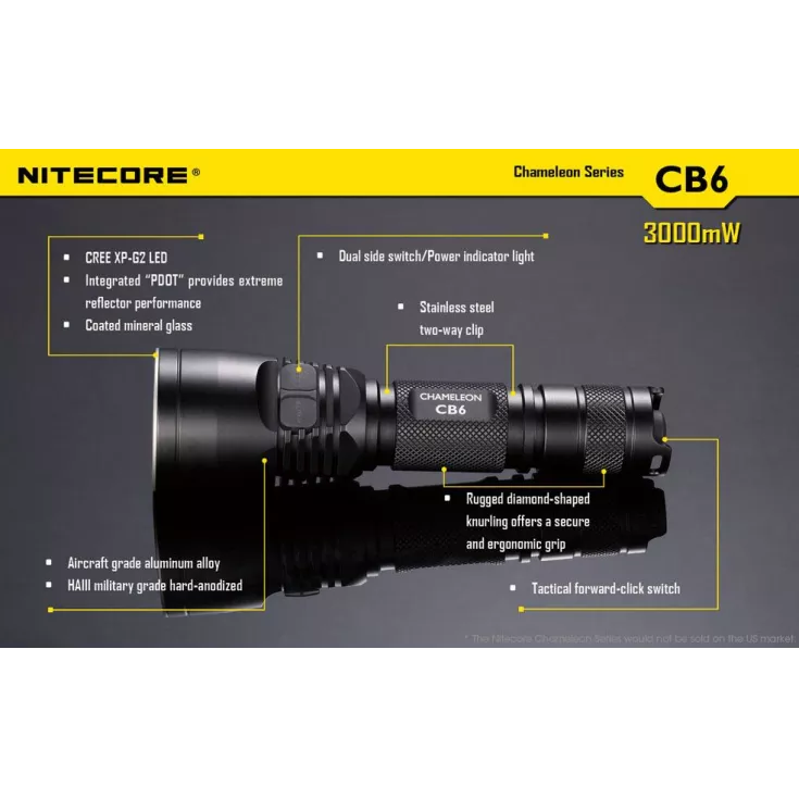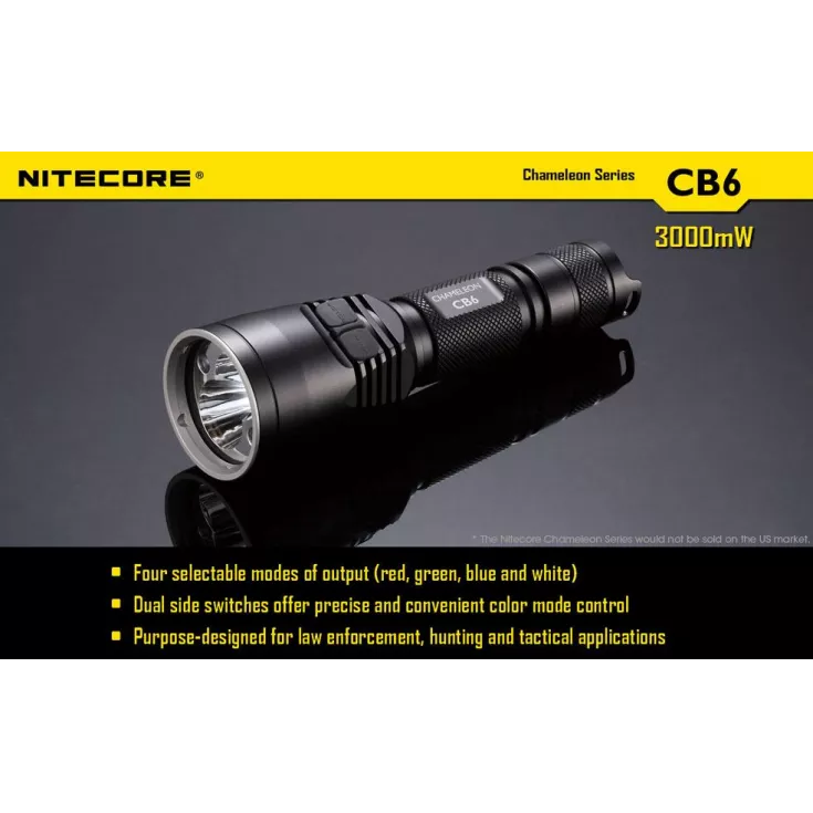 The CB6 can be gun mounted and is compatible with the Nitecore RSW-1 remote pressure switch. The battery chamber is spring loaded at both ends to ensure good impact absorption.