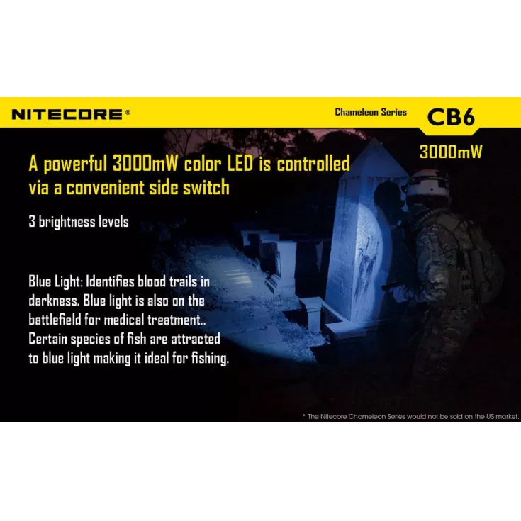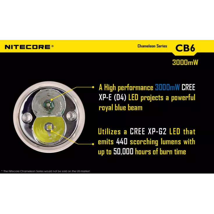 The Nitecore CB6 Chameleon features two primary lights sources. A Cree XP-G2 provides the white light with a maximum output of 440 lumens. Beside this sits a 3 watt blue LED with three output settings without the need to use any filters. A dual side switch makes selecting the desired output easy and also includes a power indicator to warn when the batteries are running low. In addition to the primary outputs there are secondary low level red, green and blue LEDs.