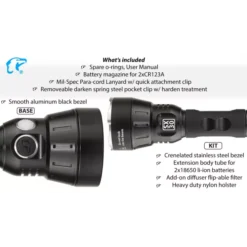 Includes: Holster, 2 x CR123A batteries, pocket clip, tactical ring, lanyard, spare tail cap and spare o-ring.