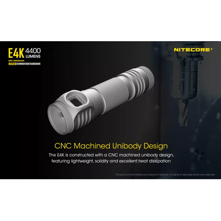 The E4K measures in at just under 12cm long and weighs only 80 grams making it an ideal every day carry torch that can easily be kept inside a pocket. The body is CNC machined as a single piece and provides excellent heat dissipation while being strong and light weight.