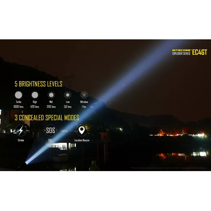 The Nitecore EC4GT has a maximum output of 1000 lumens from the Cree XP-L HI V3 and can be powered using either 4 x single use CR123 or 2 x rechargeable Li-ion 18650 batteries.