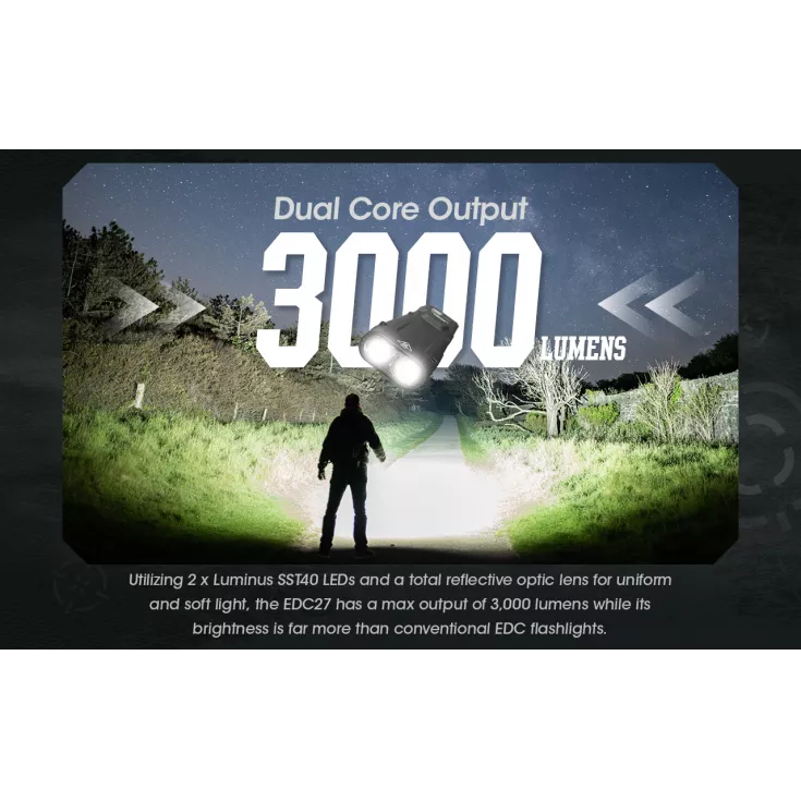 The EDC27 utilises two Luminus SST40 LEDs and a total reflective optic lens for uniform lighting beam pattern. Maximum brightness is 3000 lumens.