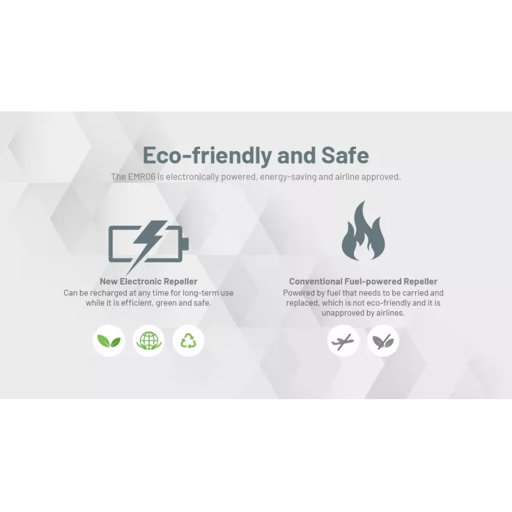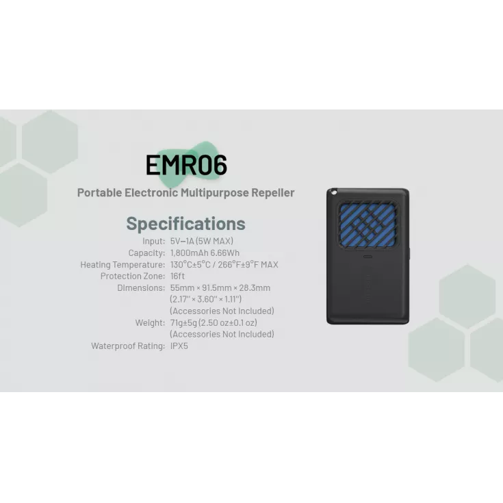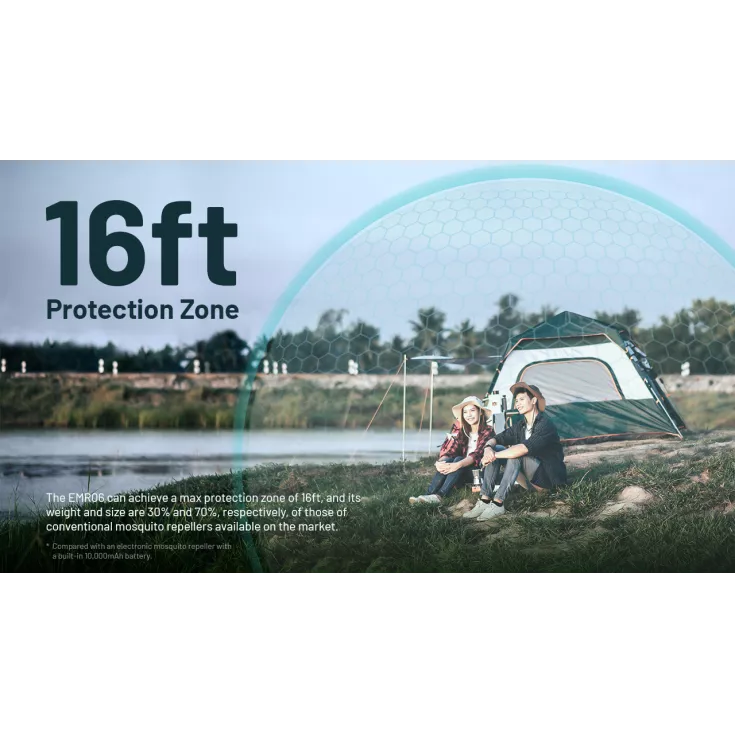 The EMR06 offers up to a 16 foot protection zone, similar to other conventional mosquito repellers, yet a 3rd of the weight and size. It  also offers a 3.5 hour runtime using the built-in 18650 li-ion battery and can be recharged using the USB-C charging cable provided.