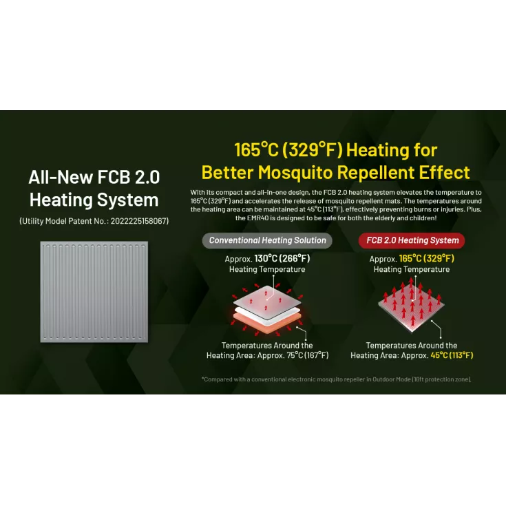 The EMR40 features an FCB 2.0 heating system. This elevates the temperature to 165°c and accelerates the release from the mosquito repellent mats. The temperature around the heated area can be maintained at 45°c, effectively preventing burns and injuries.