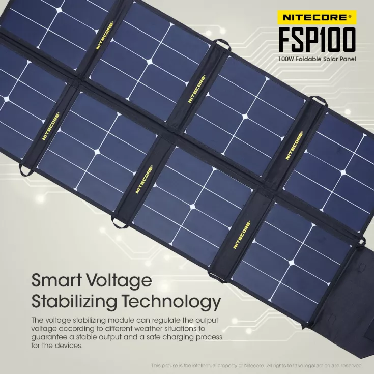 The Nitecore FSP100 is a state of the art 100w foldable solar panel. It is extremely lightweight and compact, weighing 2.1kg and folding to the size similar to a laptop.