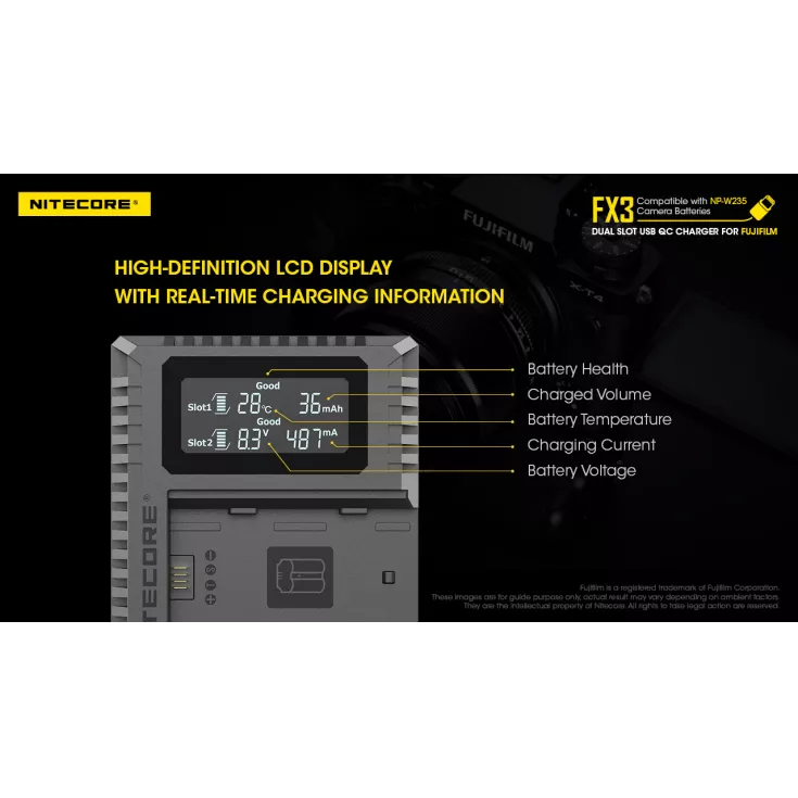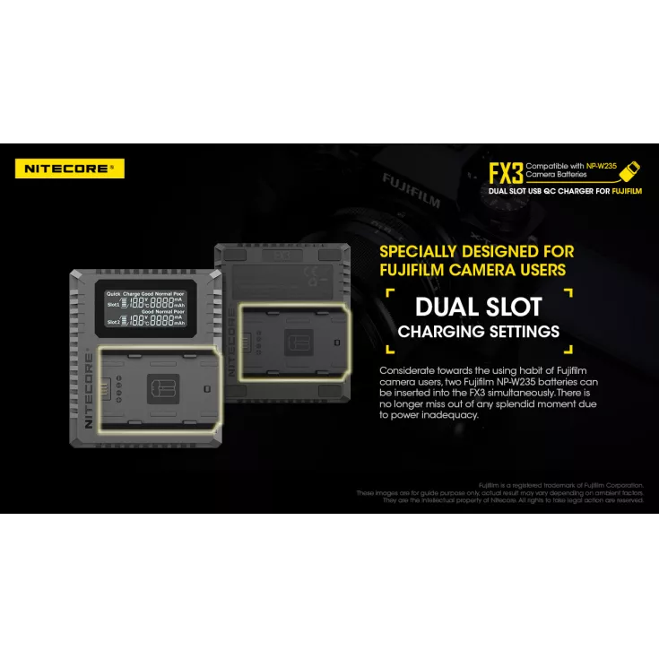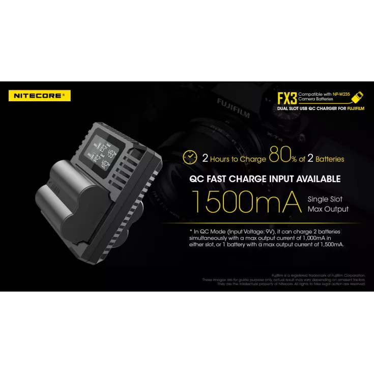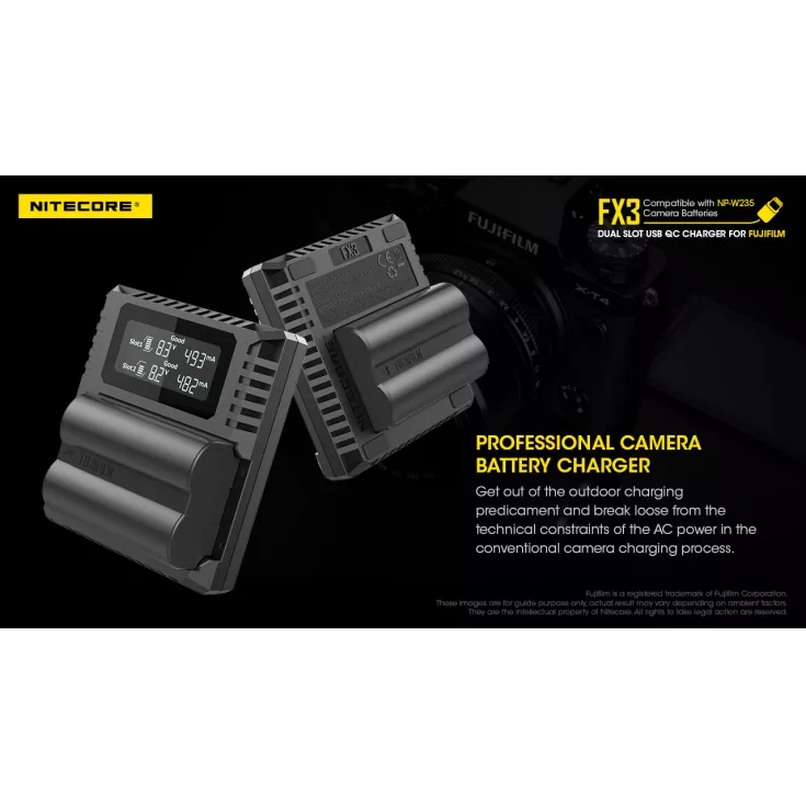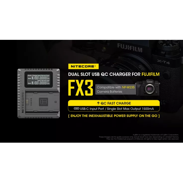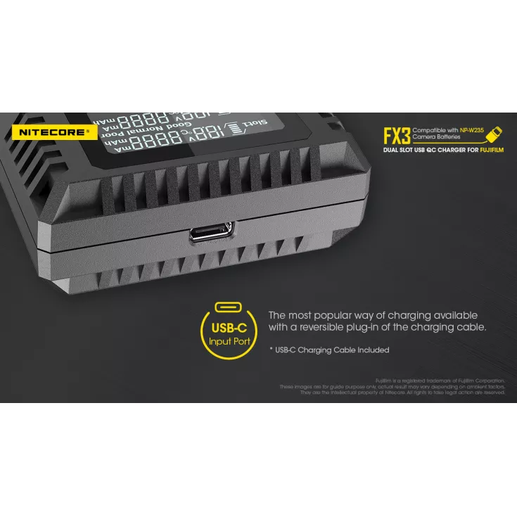 The Nitecore FX3 is a dual slot USB-C QC charger for the Fujifilm NP-W235 camera battery. With QC fast charge input available, the FX3 has a maximum output of 1500mA when using a single slot or 1000mA when using both slots. The charger has a USB-C input and comes with a charging cable (QC adapter available separately).