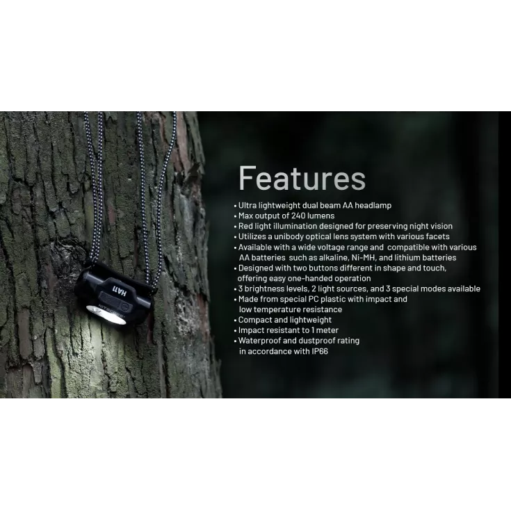 The Nitecore HA11 ultra lightweight dual beam AA Headlamp has a maximum output of 240 lumens and a beam distance of 90 meters. Running on just one AA battery, the HA11 can run for up to 40 hours.