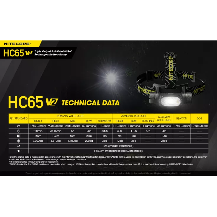 Nitecore HC65 V2 includes: Nitecore NL1835HP 3500mAh 18650 8A li-ion battery, spare o-ring, USB-C charging cable, headband and bracket.