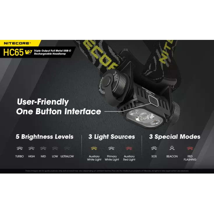 Operation of the HC65 V2 is via a user friendly single button interface that provides access to the 5 brightness levels. 3 light sources and 3 flashing modes. The switch also features a blue power indicator light that flashes to display the battery voltage and charging status.