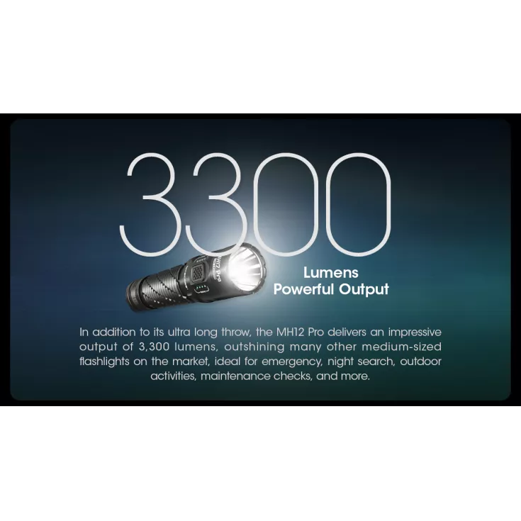 *Advanced temperature regulation will regulate the output according to ambient temperature. Runtimes are cumulative and the MH12 Pro will not sustain 3300 lumens for a full 30 minutes.