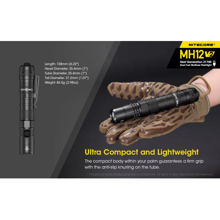 The Nitecore MH12 V2 comes with an NTH10 tactical holster for quick release and access to the torch, plus a sturdy pocket clip. The flashlight is compatible with a range of other accessories, such as the NTR10 tactical ring, 25.4 mm (1″) filters and diffuser tip (available separately).