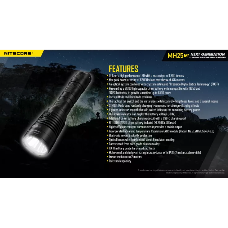 The MH25 V2 has a maximum output of 1300 lumens and a beam distance of 475 meters. The torch is rechargeable using the USB-C cable provided. The torch is also compatible with 18650 and CR123 batteries (available separately). Operation is via dual switch setup with a forward click tactical tail switch with momentary-on functionality and a metal side switch to change brightness. A blue indicator light is built into the side switch and flashes to display the remaining battery voltage.