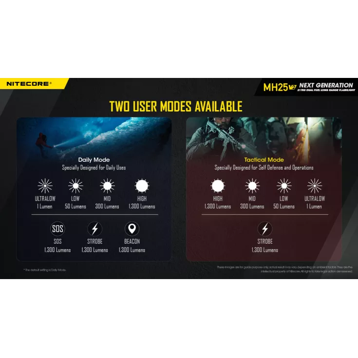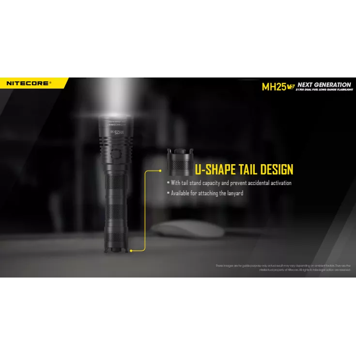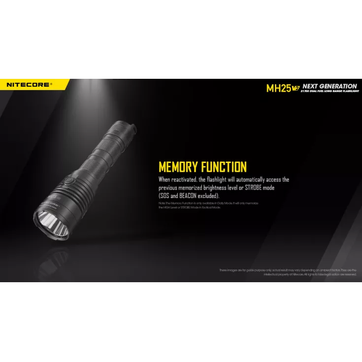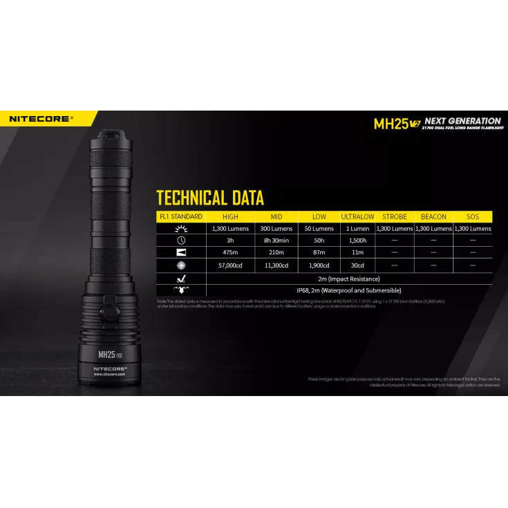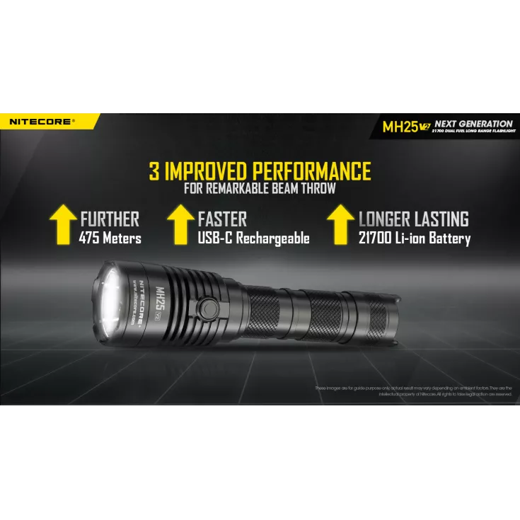 The Nitecore MH25 V2 features a high performance LED with a maximum output of 1300 lumens and a range of up to 475 meters.