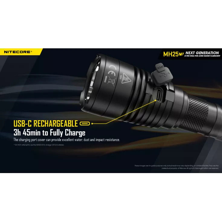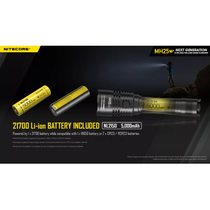 The torch is rechargeable via a USB-C port on the side of the head and includes a NL2150 5000mAh 21700 Li-ion battery, which charges inside the light in approximately 3 hours 45 minutes. In addition to 21700 cells, the MH25 V2 is also compatible with 18650 and CR123 batteries (available separately).