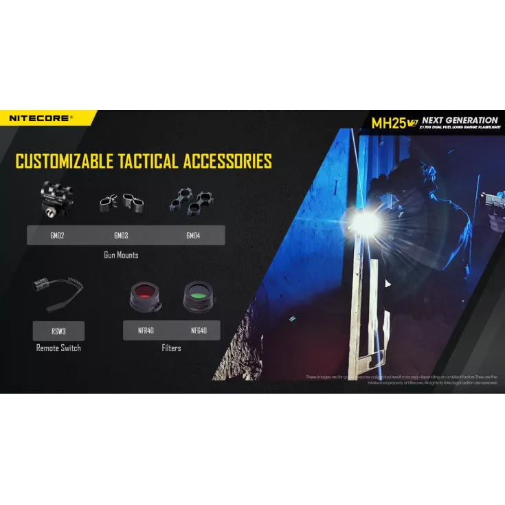 Compatible with a wide range of Nitecore accessories including the 40mm filters and diffusers and also the RSW3 remote switch.
