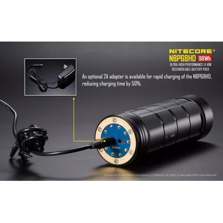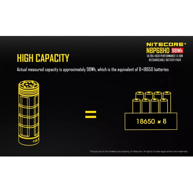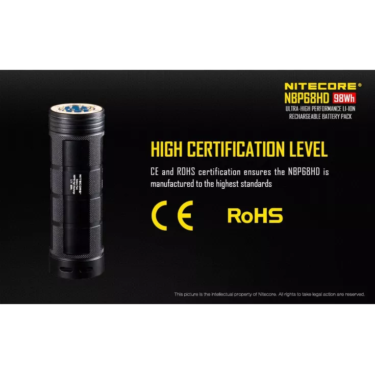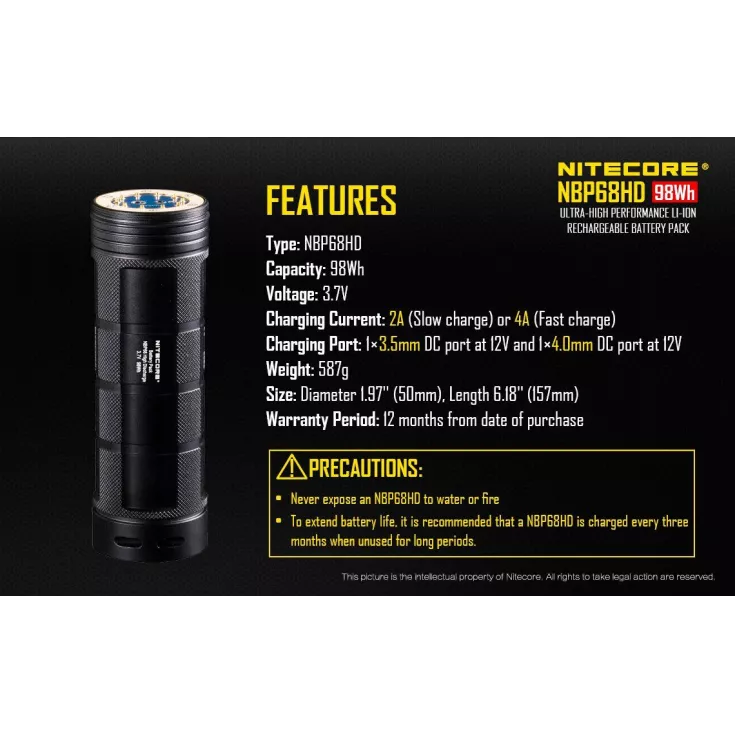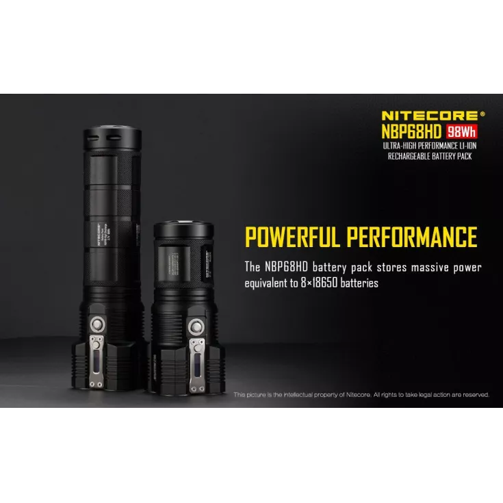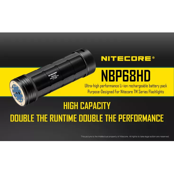 The battery pack has a high capacity, approximately 98 Wh, offering the same power as 8 x 18650 batteries! This abundance of power, makes the NBP68HD ideal for poweing a TM torch. The pack is compatible with the Nitecore TM28, TM26, TM26GT, TM15, TM36, TM36 Lite, TM39 Lite, TM39.