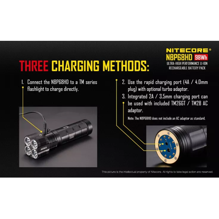 The battery pack has three charging methods, making it easy to keep it charged and ready to power your flashlight. The NBP68HD can be attached to a compatible TM series torch (listed above) for direct charge via the flashlight. Alternatively, the battery pack has a rapid charging port which requires a rapid charger adaptor (sold separately), or use the 2A charging port with the AC adaptor that comes with the TM26GT and TM28.