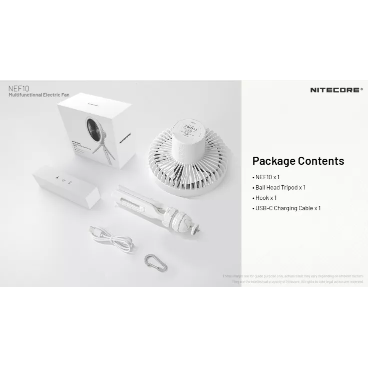 Includes: 1 x NEF10, 1 x Ball Head Tripod, 1 x USB-C charging cable