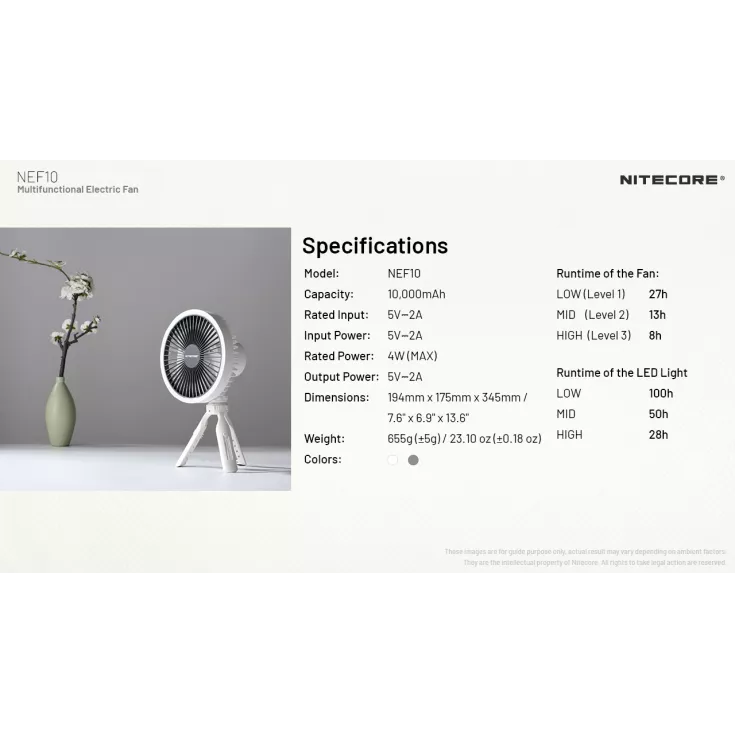 Powered by a built-in 10,000mAh large capacity Li-ion battery, the fan offers a runtime of up to 27 hours and can be fully charged in 4.5 hours. A USB-C input and USB-A output with an anti-dust cover allows the NEF10 to be used as a power bank.