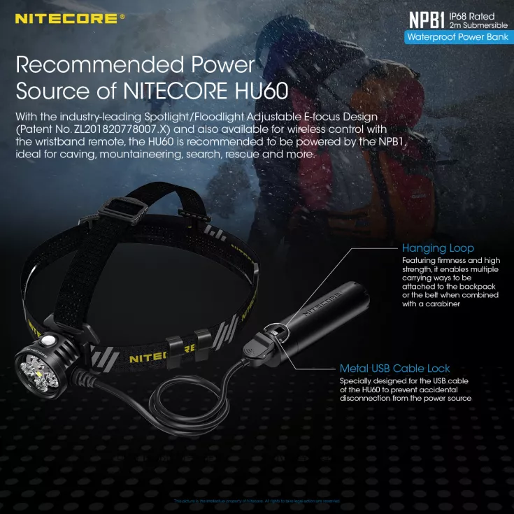 Featuring a 21700 5000mAh Li-ion power cell, the NPB1 has an energy density of 173mWh/g. Sufficient to charge an iPhone 11 once or a Nitecore NU32 headlamp twice. Another recommended use of the NPB1 is as a power source for the Nitecore HU60 head torch, which requires an external powerbank to operate.