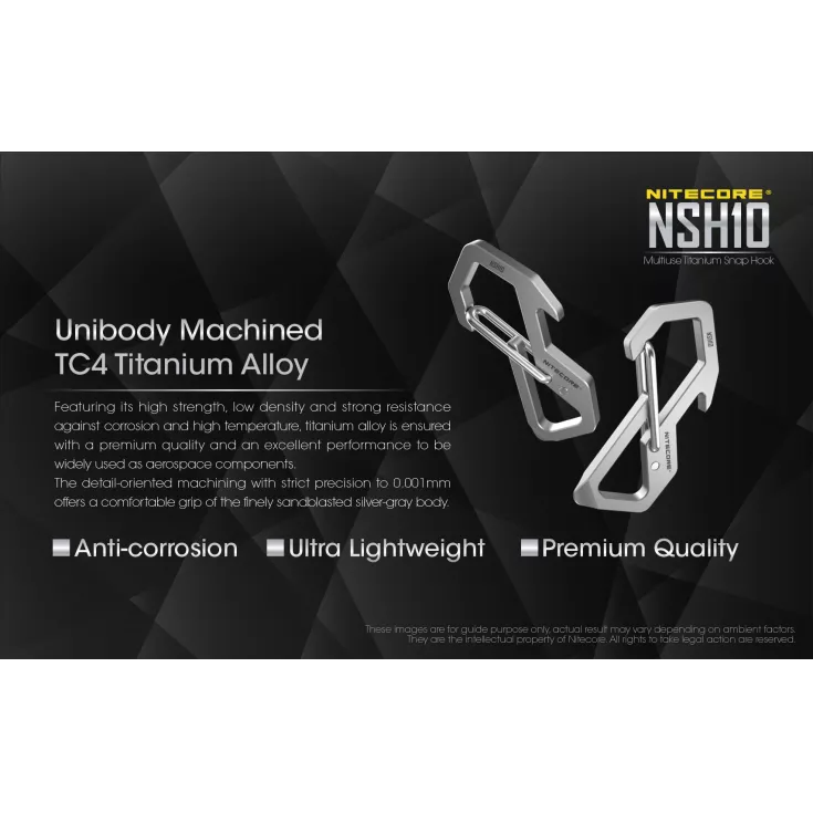 The Nitecore NSH10 multi-use snap hook features a unibody design and is machined from high strength, low density, TC4 titanium alloy. This material is also extremely lightweight and offers excellent corrosion resistance.