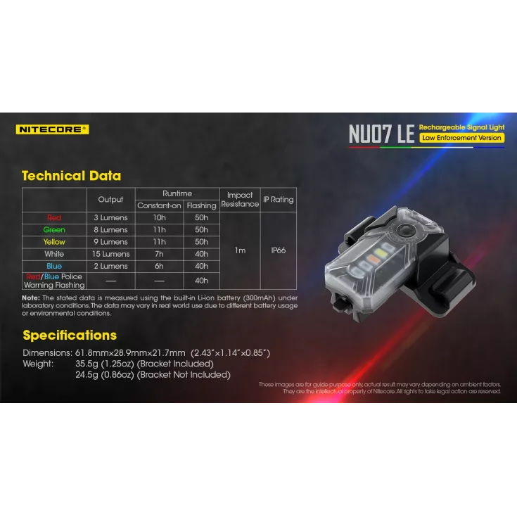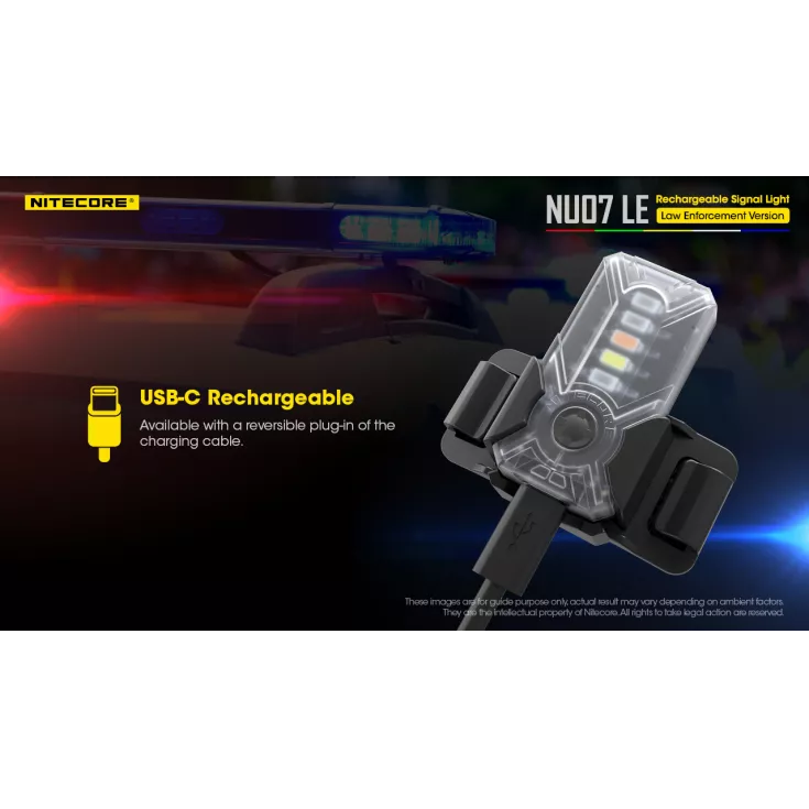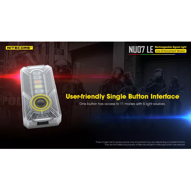 The Nitrecore NU07 LE is a rechargeable signal light with 5 light sources; Red, Green, Yellow, White & Blue with 11 different modes. Mode memory function remembers the last used mode when reactivated.