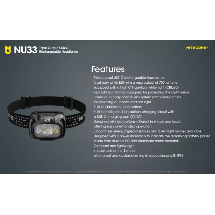 The headtorch is ultralight and compact, weighing just 95.5g. It has a durable and rugged construction, including the front housing which is made from aluminium, providing high efficiency heat dissipation and ideal for outdoor environments. The NU33 headtorch is perfect for night running, outdoor adventures and camping, plus lots more!