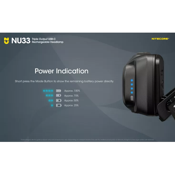 The NU33 features a primary white light, plus an auxiliary red light and an auxilary white light. The auxilary red is useful when stargazing, wildlife observations, night photography and emergency response. All outputs can be accessed with the user-friendly dual button interface. A battery power indicator can also be accessed with a short press of the mode button.