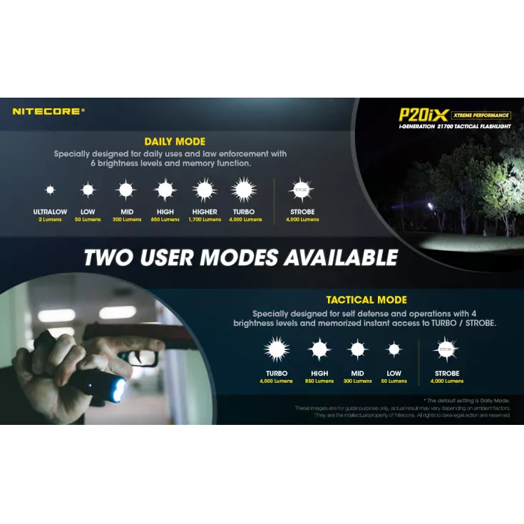 Nitecore P20iX includes: Nitecore NL2150HPi 5000mAh battery, CR123A battery magazine, NTH20 Holster, USB-C charging cable, wrist lanyard, pocket clip and spare o-ring.