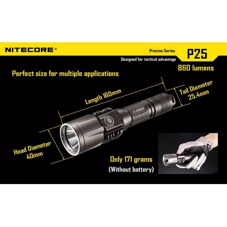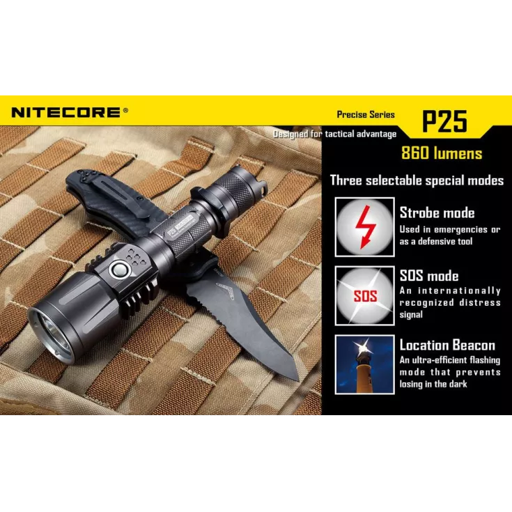 The Nitecore P25 Smilodon is a tactical light with some very interesting and unique features including a dual stage camera style switch on the side of the head, this allows for easy one handed operation and also lights up to act as a power indicator.