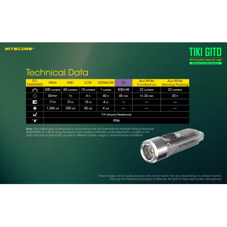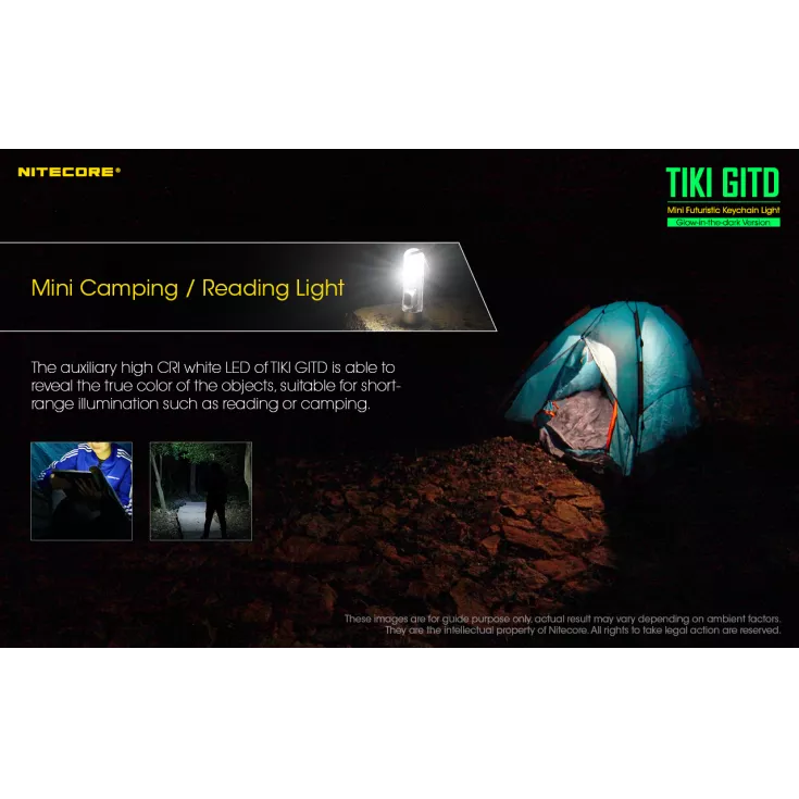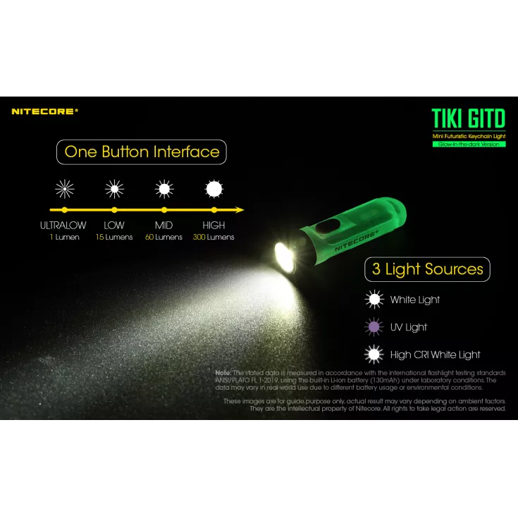 As with the other TIKI lights, the GITD version features two auxiliary LEDs; a high CRI white LED and a 365nm 500mW UV LED. These additional light sources make the keychain torch suitable for a broader range of applications, such as reading, camping and checking for counterfeit currency and documentation.