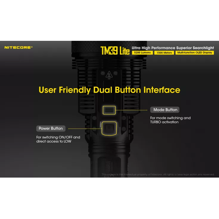 The Nitecore TM39 Lite features four brightness levels, ranging from 200 to 2500 lumens, and three special modes for emergency use. The flashlight is operated using a dual switch interface for fast and easy access to the modes, including direct access to the Turbo and Low outputs.