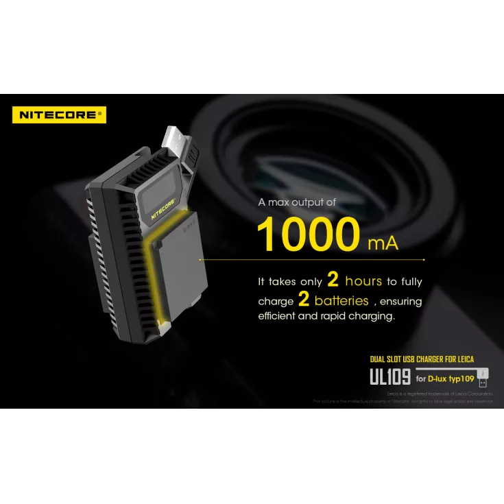 The Nitecore UL109 is a dual slot USB charger, specially designed for the Leica D-lux typ109 camera which is compatible with the BP-DC15-E battery. Compatible with a range of input sources, the UL109 takes it power via a USB cable which makes it compatible with power banks, solar panels and USB adapters.